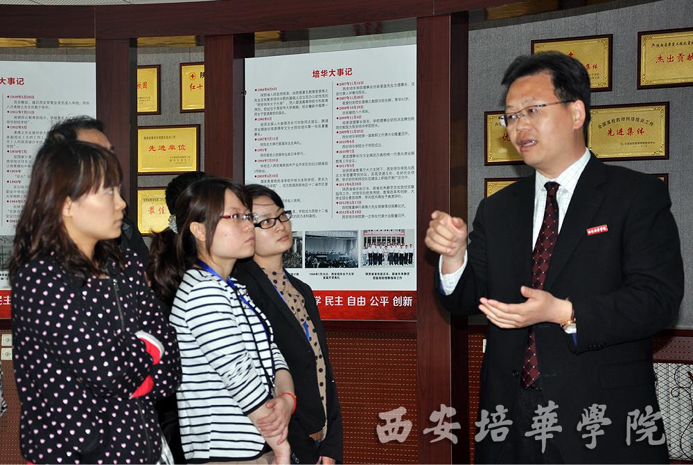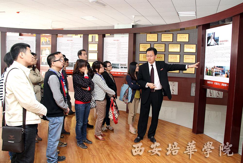 在我校理事长姜波的陪同下,媒体考察团一行首先参观了我校明德楼展厅,姜波理事长向到访来宾详细地介绍了我校的历史沿革、基本概况、办学理念、办学特色、学科建设、校园文化建设、人才培养创新等诸多方面内容。“这一张张照片,一行行文字,都代表着培华这八十四年来所经历的风雨和取得的成就,那些艰苦奋斗的岁月,一代代培华人永远铭记在心……”在听到培华老校长姜维之先生的生平事迹和当年老培华不收取任何费用,培养造就了一批优秀的平民女性时,来宾们纷纷表示对培华精神的敬佩和取得成绩的肯定。我校电气信息工程学院王旭东同学向来宾介绍了他的团队在校创新实验室里设计制作的电子产品,来宾们赞叹不已。