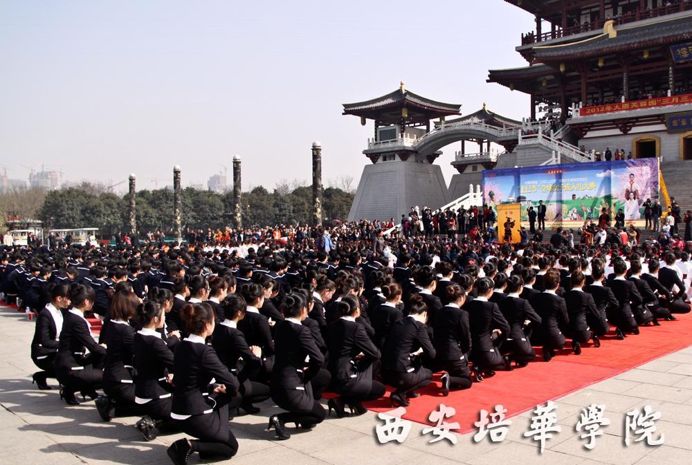 3月24日,适逢中国传统节日“三月三上巳节”,全球女子成人礼在西安大唐芙蓉园隆重举行,唐诗“三月三日天气新,长安水边多丽人”中描绘的上巳节风情在这里重现。天涯社区联合我校百余名大一女生身着统一服装,由女子学院王翠老师带队列成方阵参加该活动,成为大唐芙蓉园一道亮丽的风景线。 在紫云楼北广场,千名女子伴随着东仓鼓乐之声,依照古时习俗进行盥洗、束发、三拜之礼等仪式, “零距离”体验中国传统文化,感受我国传统文化的魅力。