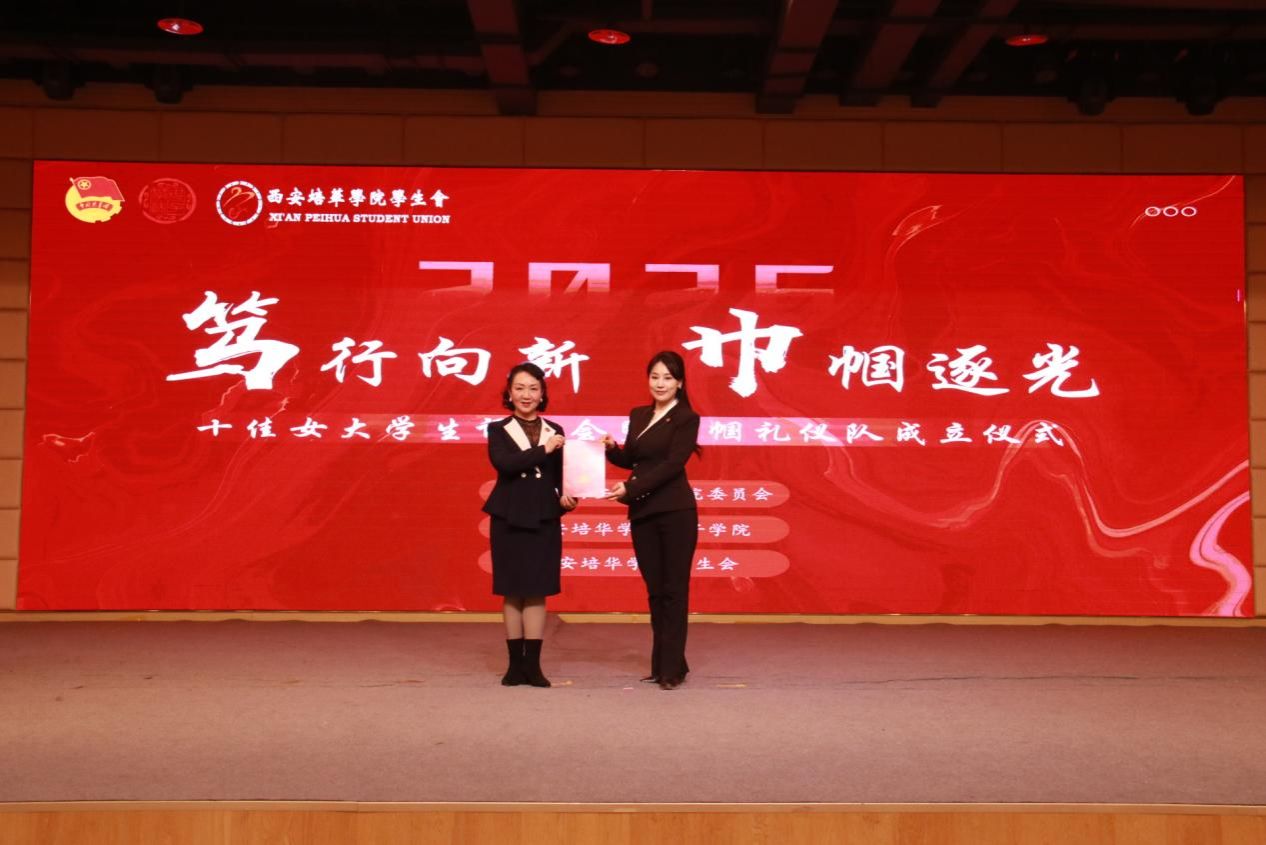 巾帼礼仪队成立仪式正式拉开帷幕,彰显了学校推动女性素养提升、传承中华礼仪文化的坚定决心。女子学院教师张文悦宣读了西安培华学院巾帼礼仪队成立文件,明确了礼仪队的成立意义、宗旨使命与主要职责,强调礼仪队将成为展现学校女大学生风采、传递文明力量的重要载体,助力规范校园礼仪服务,提升学生综合素养,也是学校深化女性教育、完善育人体系的重要举措。随后,由校团委书记董莹为巾帼礼仪队授牌,并为礼仪队成员颁发聘书,这不仅是对礼仪队的正式赋能,更是学校对礼仪队建设的殷切期望,为礼仪队规范化运营确立了制度基础与组织架构。
