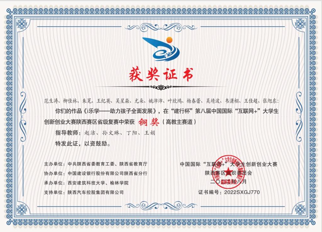 2022年8月荣获第八届中国国际“互联网+”大学生创新创业大赛省级铜奖;