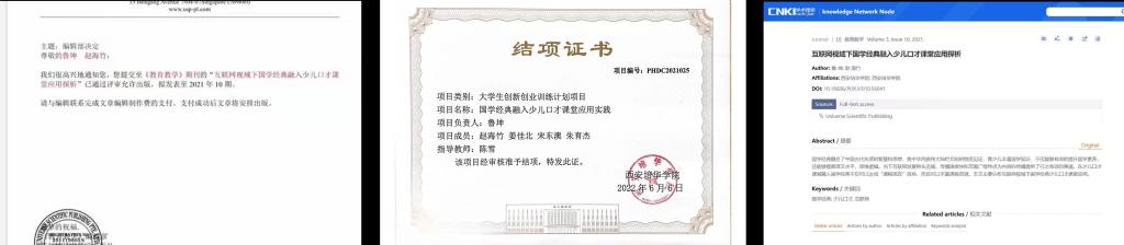 本项目依托导师的横向课题,参与西安仟艺教育培训公司的课程研发和宣传,主要研究国学经典有机融入少儿口才课堂的应用途径。线上设立抖音账号,定期进行国学经典元素板块的原创视频录制并发布,线下设立“国学经典口才课堂”,与横向课题合作单位进行本项目的研究探索与课堂实践,通过少儿个人及集体涵带国学元素的口才才艺展示等形式进行成果的展演,并以此作为阶段性检验,进一步推动本项目的研究探索。