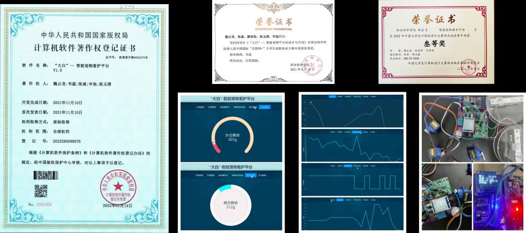 “大白”—智能宠物看护平台有效解决了携宠出行难的问题, 本项目综合安全使用、便捷管理、综合服务的理念,主要是通过STM32单片机对WiFi芯片、温湿度传感器、红外感应传感器、红外 测温传感器、喂食喝水铲屎装置等模块的控制,实现对宠物日常生活的照料。该平台通过软硬件联合的方式结合数据可视化使得数据以图像的形式展示出来。并将硬件采集的宠物食盘和水盘的压力信息,宠物窝环境的温湿度信息以及宠物体温等信息实时显示。