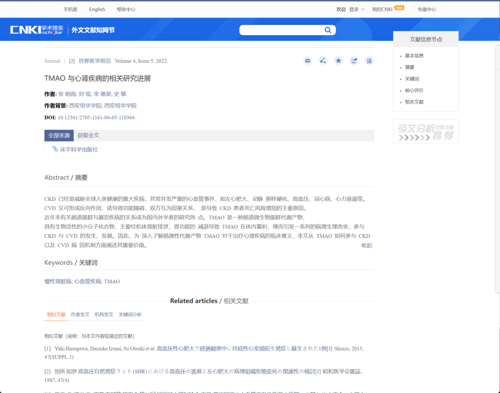 项目简介:CKD已经是威胁全球人类健康的重大疾病,其常并发严重的心血管事件,如左心肥大、动脉粥样硬化、高血压、冠心病、心力衰竭等,CVD又可形成反向作用,诱导肾功能障碍,双方互为因果关系,是导致CKD患者死亡风险增加的主要原因,近年来有关肠道菌群与器官病的关系成为国内外学者的研究热点。TMAO是一种肠道微生物菌群代谢产物,具有生物活性的小分子化合物,主要经机体肾脏排泄,肾功能的减退导致TMAO在体内蓄积,继而引发一系列的病理生理改变,参与CKD与CVD的发生、发展,为了深入了解肠原性代谢产物TMAO对于治疗心肾病的临床意义,本文从TMAD如何参与CKD以及VD病 因机制方面阐述其重要价值。