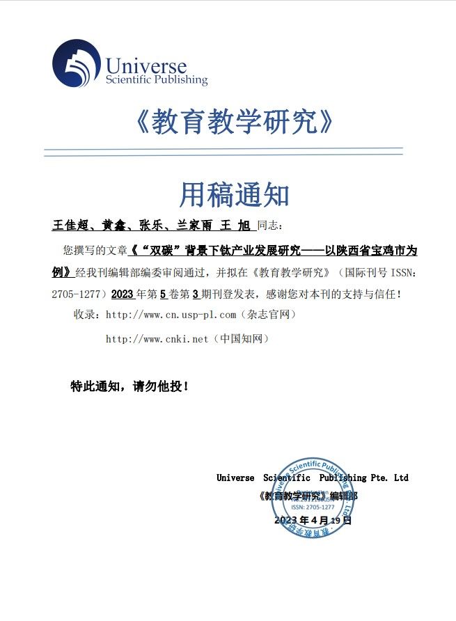 项目简介:本项目通过对宝鸡钛产业的调研,以了解宝鸡工业的支柱产业——钛产业在“双碳”背景下,产业发展中存在的问题,进而参考其他地区相关钛产业发展经验的基础上,进一步提升相关产业良性发展的模式,从而为宝鸡钛产业发展注入新的活力,为当地产业融合发展提供新思路,增强当地产业可持续发展,实现该地区钛产业的正向发展,同时带动当地钛产业的上下游企业整体发展,推动该地区的经济发展,在此基础上为类似地区的钛产业振兴提供参考。我们项目基于此展开了深入调查研究,并撰写项目调研报告一部、钛产业行业研究报告一部、发表学术论文一篇。