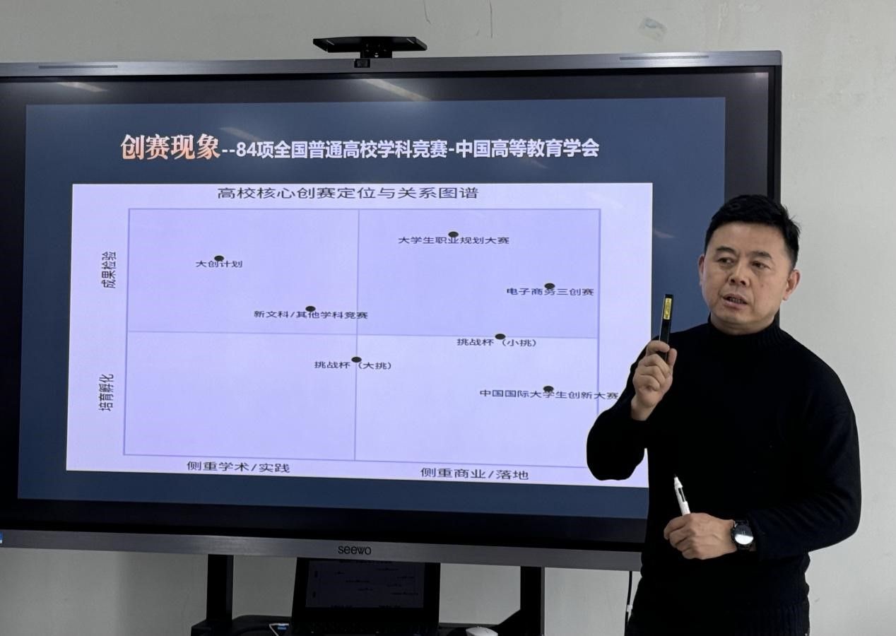 随后,创新创业教研室主任王楠紧扣前述核心内容,为全体教师带来“三位一体”实操行动指南:一是聚焦教师成长,提出从 “知识传授者” 向 “项目合伙人” 角色转变的师资培育新路径;二是深耕赛事指导,明确从项目挖掘到路演打磨的全周期精细化辅导策略;三是强化团队培育,分享跨学科组建学生梯队、激发学生内生动力的具体方法。王楠主任的分享兼具理论高度与落地抓手,为全校教师提升双创指导能力指明了清晰方向。