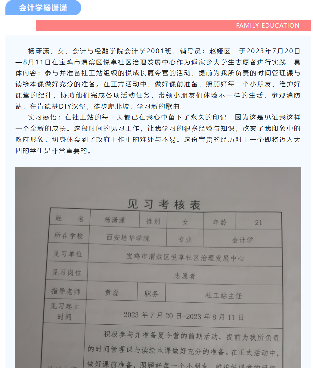 宋昱洁,女,汉族,中共预备党员。该生在校期间保持着积极向上的心态,时时以高标准要求自己,不仅刻苦学习,取得了优异的课程成绩,而且积极参加各种实践活动,努力做到全面发展。在思想上,积极上进,热爱祖国,积极向党组织靠拢,成为中共预备党员。在学习上,在学好专业课程的同时,考取了英语四级证书和普通话证书,获得了正大杯第十三届全国大学生市场调查与分析大赛陕西赛区本科组选拔赛—团体三等奖,连续两年获得西安培华学院三等奖学金并且年级成绩位于年级前15%。在工作上,作为班长和院系青协媒体运营部部长,积极协助老师筹备和开展了开学迎新活动、各类志愿活动,以及班级创建“姜维之班”等。在生活方面,该生严于律己宽以待人,关心集体诚实守信,建立了良好的人际关系。担任宿舍舍长,曾在第五届宿舍公约大赛中荣获优秀奖,在学生服务中心公寓检查第十二周,宿舍检查结果为优。在工作方面,该生为班长和院系青协媒体运营部部长,积极协助老师筹备和开展了开学迎新活动、班级创建“姜维之班”,以及诸多志愿活动。在社会实践方面,在2023年7-8月 参与“返家乡”活动,在陕西省渭南市临渭区官底镇人民政府党政综合办公室见习,增强了沟通与协调能力,坚持德智体美劳全面发展。