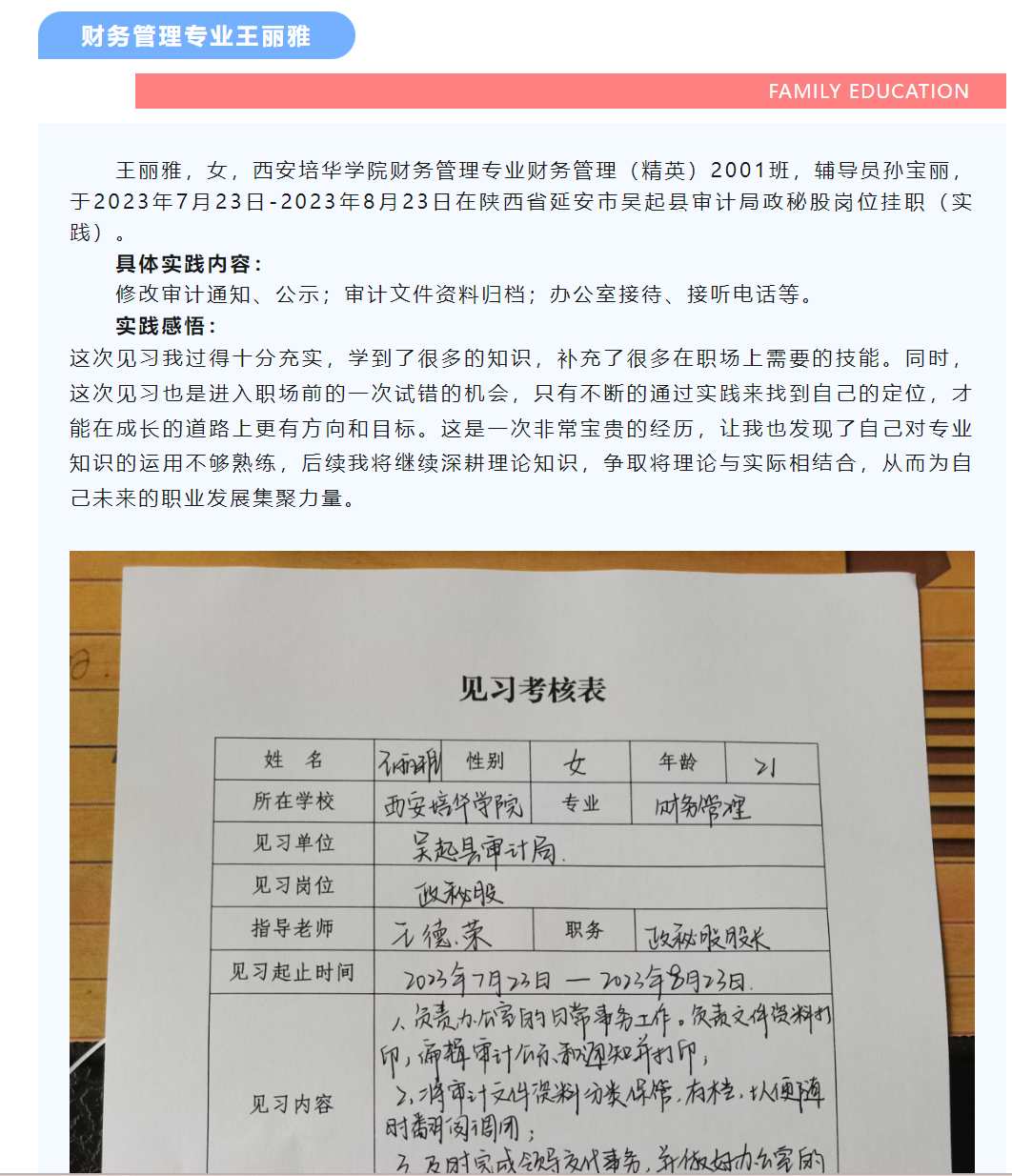 会计与金融学院财务管理2202班学生2023年5月成为2022级校会志愿者、 2023年3月在“迎审核评估,学雷锋精神,传培华校史”知识竞赛中荣获“特等奖”2023年4月获得商务办公专家 (高级)证书。自从进了院党委工作,能够立足本职岗位,服务同学,锻炼自己。在思想上,不断向党组织靠拢,树立正确的价值观和人生观,以高标准严格要求自己。积极参加学校各种活动,积极工作,不断丰富自己,提升自身能力。在工作半年的时间内,提升自己的组织能力和协调沟通能力。在今后我会以党员的标准要求自己。在生活方面,性格开朗,乐于助人,积极带动身边的同学共同学习、共同进步,主动帮助有困难的同学。对工作热情,责任心强,具有良好的组织交际能力,并时刻以优秀共产党员模范标兵为指引。积极配合党委负责老师有序开展党支部工作,做好协调与配合。