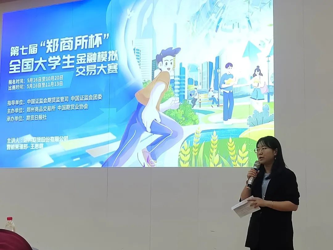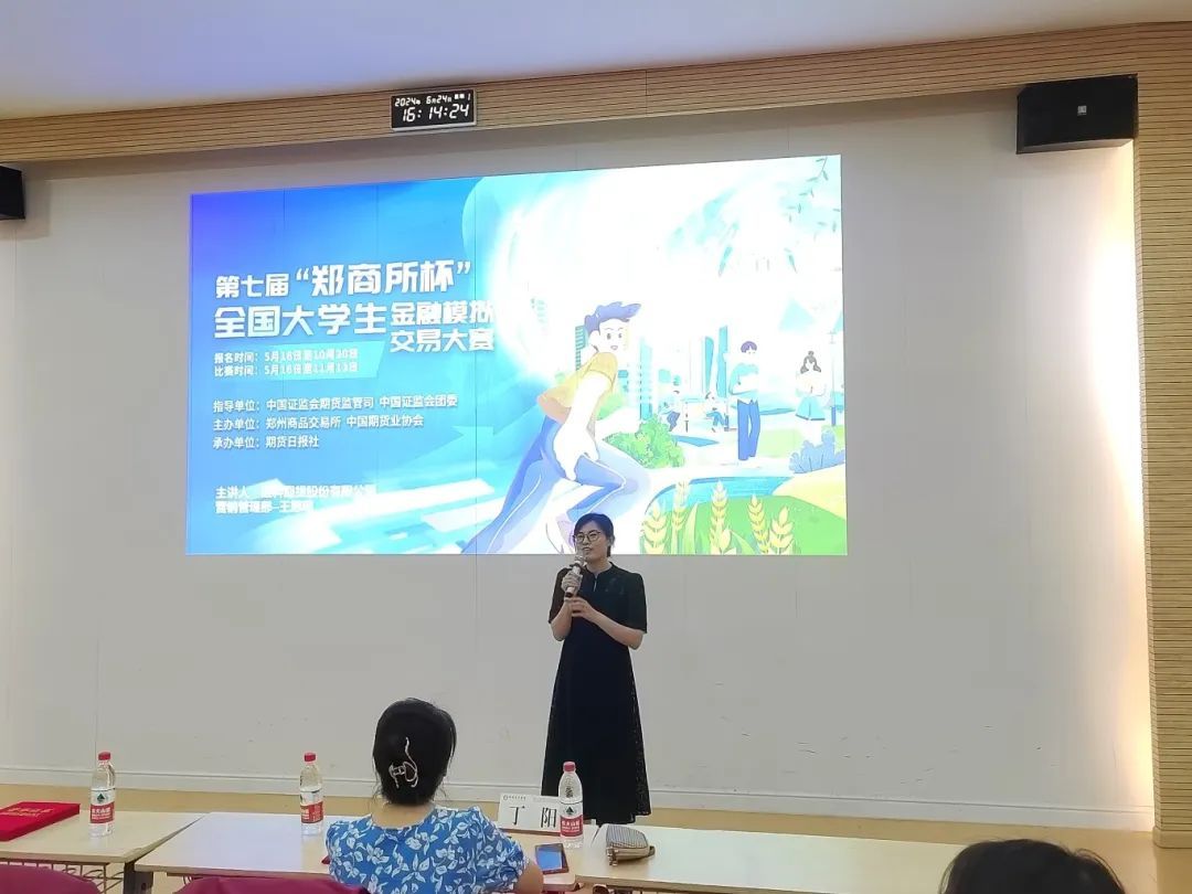 颁奖仪式后,迈科期货代表王思萌详细介绍了即将到来的第七届“郑商所杯”全国大学生金融模拟交易大赛的比赛内容、流程和注意事项。对“郑商所杯”报名方式、软件下载及使用方法进行详细讲解,同时强调比赛的目的是培养学生的实际操作能力和市场分析能力,提醒参赛者注意比赛规则,确保比赛的公平性和公正性。