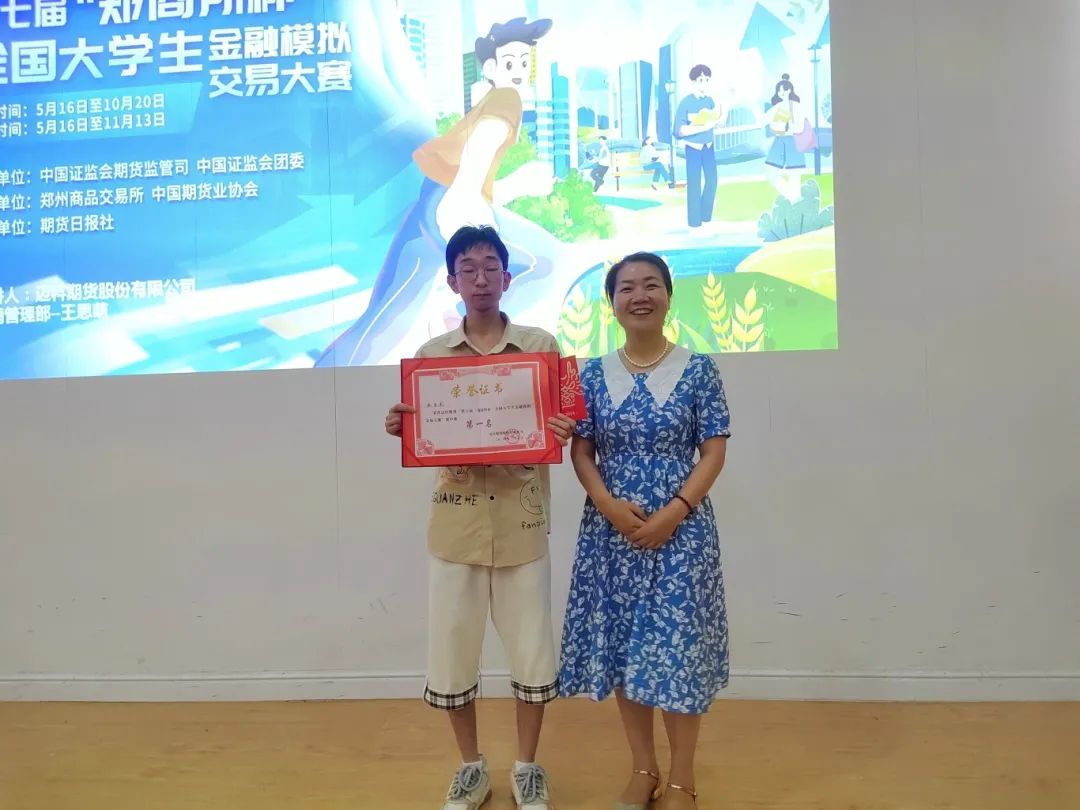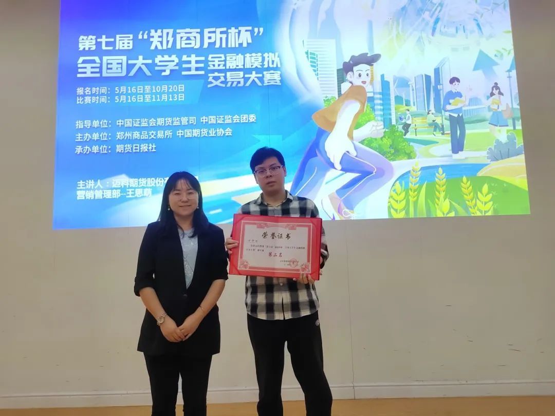 会议开始,举行第六届”郑商所杯“全国大学生金融模拟交易大赛颁奖仪式,由丁阳副院长和迈科期货代表王思萌分别向获奖学生颁发荣誉证书和奖金,表彰他们在模拟交易大赛中的卓越表现。金融工程20级张权威同学,以其出色的交易策略和市场分析能力荣获本次大赛的第一名,金融工程20级田帅帅同学,以其稳健的投资决策紧随其后,荣获第二名。两位获奖者不仅展现了个人的专业素养,也代表了金融工程专业学生的优秀水平。