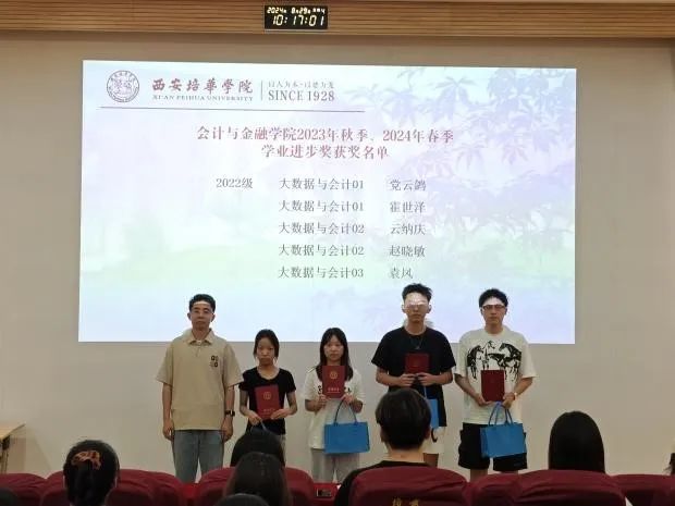 为表彰先进,树立学习典范,将学校关于养成学生自主学习的教育理念推广、推深。2024 年 8 月 29 日,会计与金融学院在阶梯教室 J201举行了2023 年秋、2024 年春学业进步奖表彰大会。