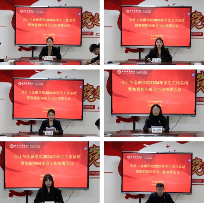 在认真聆听述职后,刘斌书记对 2024 年学院学生管理工作进行了全面总结。他充分肯定了全体辅导员一年来的辛勤付出与取得的显著成绩,同时也精准指出了工作中存在的问题与挑战。展望 2025 年,刘斌书记对学生管理工作提出了明确要求,同时对寒假五育并举工作进行安排,强调要进一步加强思想政治引领,创新工作方法,提升服务质量,打造更加优良的育人环境,助力学生全面发展。此次述职大会不仅是对过去一年工作的复盘,更是为新一年工作谋篇布局的重要契机。会计与金融学院辅导员团队将以此次会议为新起点,砥砺奋进,为学院学生工作再上新台阶贡献力量,开启 2025 年学生管理新篇章。