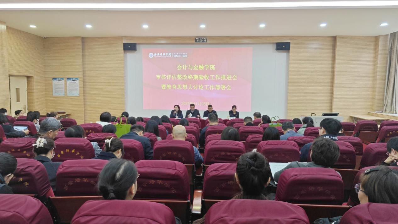 2025年10月5日16时,会计与金融学院在J201教室召开全院教职工大会,会议以审核评估整改终期验收工作推进及教育思想大讨论工作部署为主题。院长吴旺延、党委书记兼行政副院长刘斌、教学副院长孟君、院长助理吴春娜及全体教职工参加会议。会议由刘斌副院长主持。
