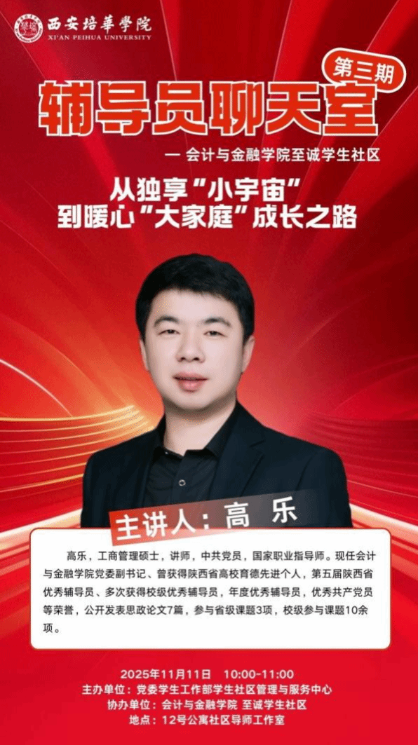 本次“辅导员聊天室”活动将于本月与大家见面,在会计与金融学院至诚学生社区温馨开启。活动将分为多个场次,以满足不同学生的时间需求。