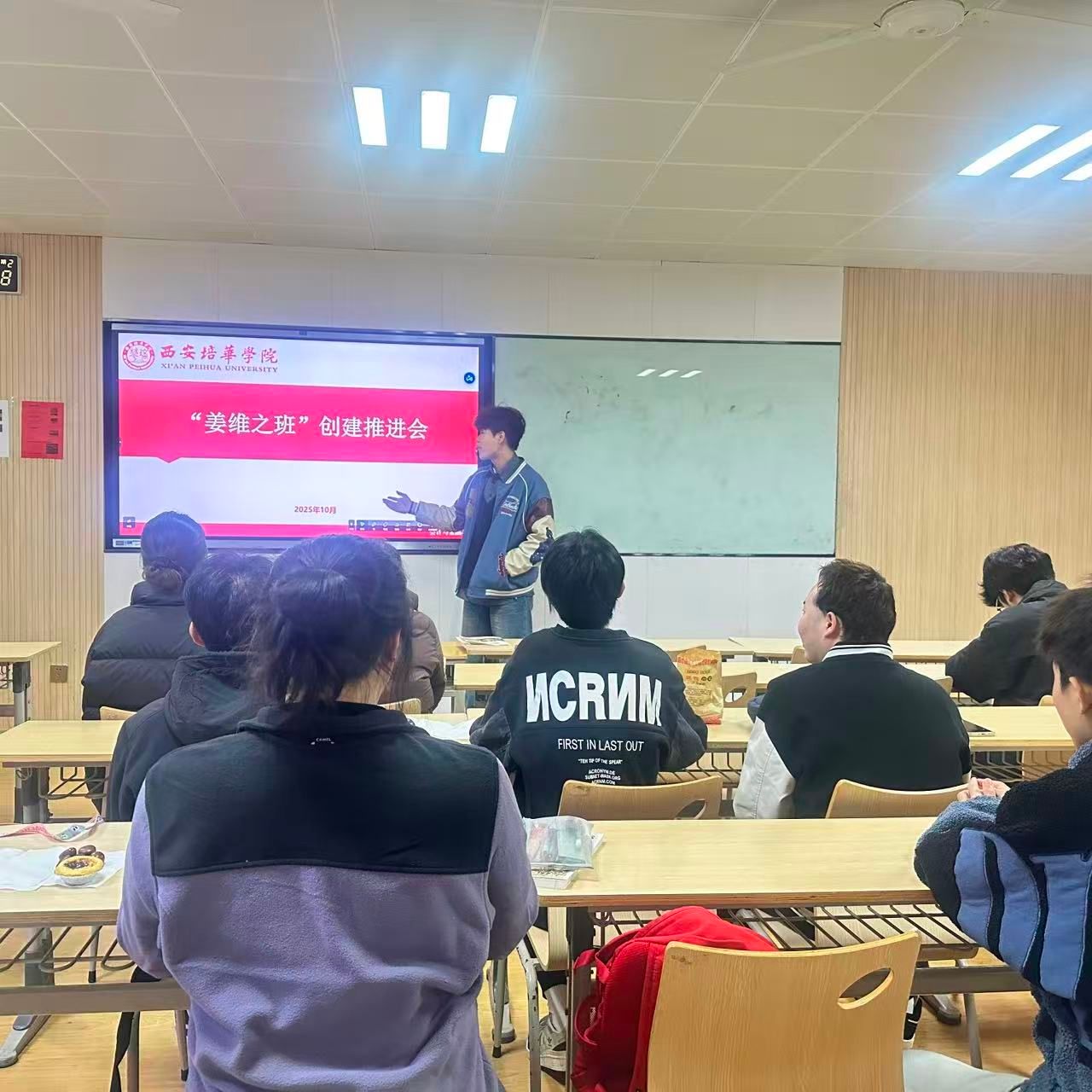 2025会计学(专升本)02班召开本学年“姜维之班”创建推进会,45名同学全员到场,班委牵头主持,电子屏显示“凝心聚力抓推进,对标对表促落实”主题。会上,学习委员汇报“会计实操技能小组”组建进展,指出部分小组协作效率不足;同学们以小组为单位,围绕“姜维之精神融入日常学习”“下月志愿服务策划”讨论建言。班长汇总方案,明确下一阶段完成2次技能模拟训练、提升竞赛报名人数,45名同学当场签署任务认领表,推动班级从“启动创建”向“实质推进”转变,为后续工作筑牢基础。