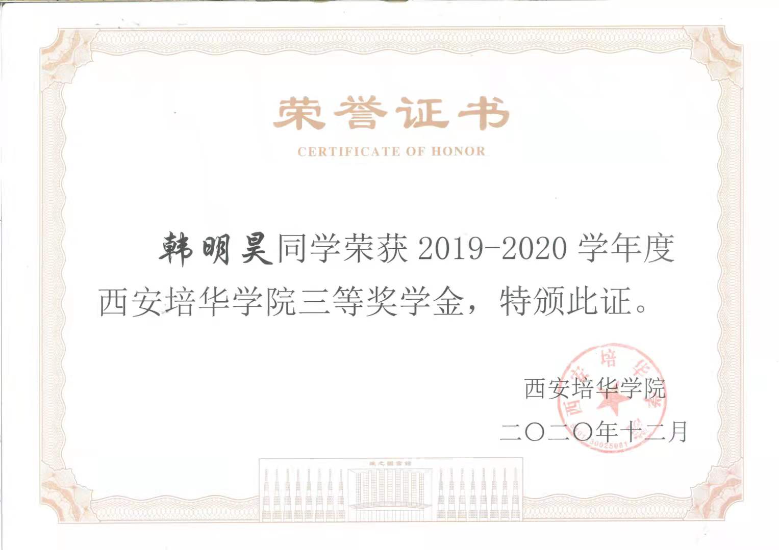 2020年12月,荣获2019-2020学年度西安培华学院三等奖学金