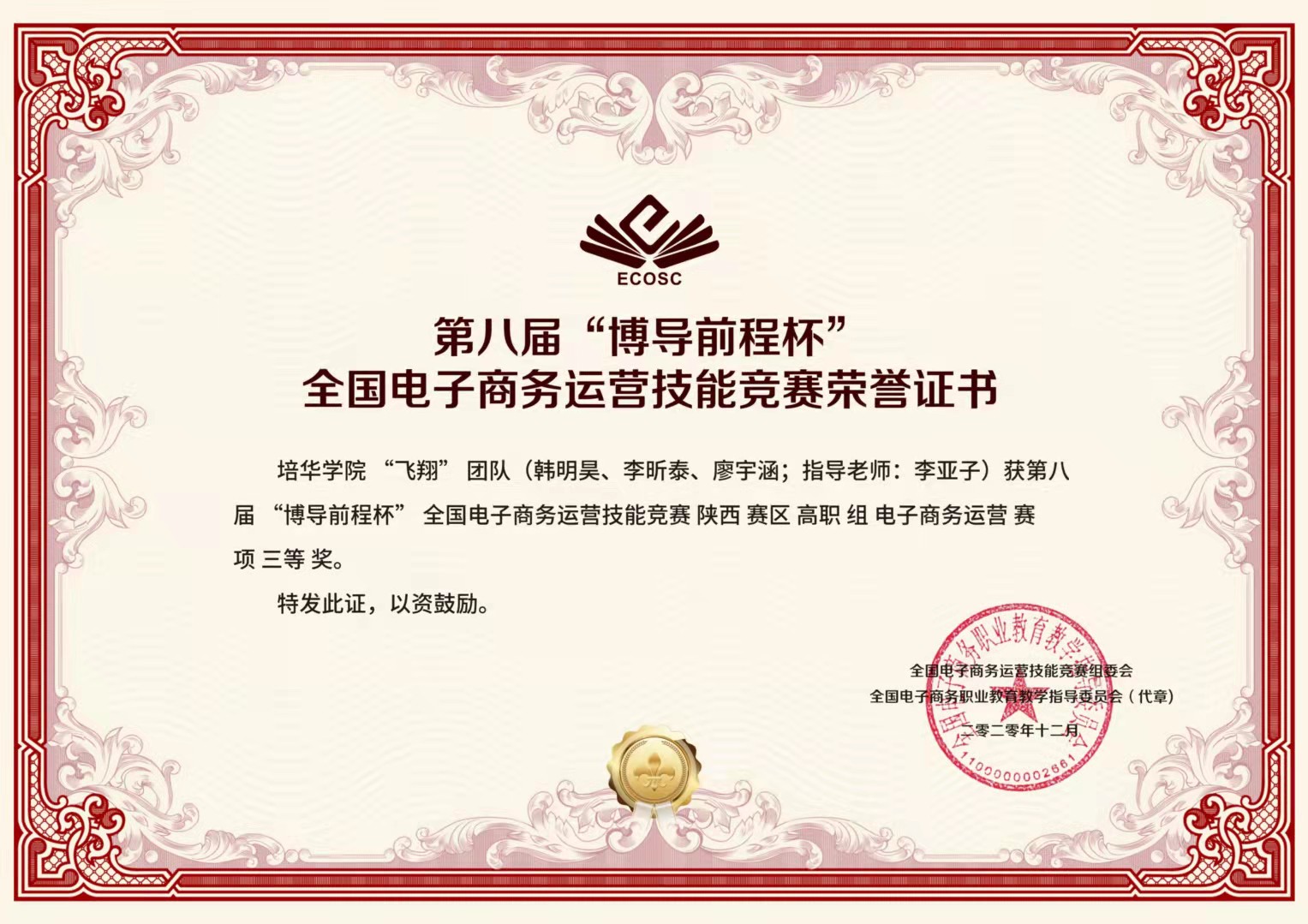2021年9月,荣获“双百工程”山阳杯旅游策划大赛二等奖2020年12月,荣获第八届“博导前程杯”电子商务运营能竞赛省级“三等奖”