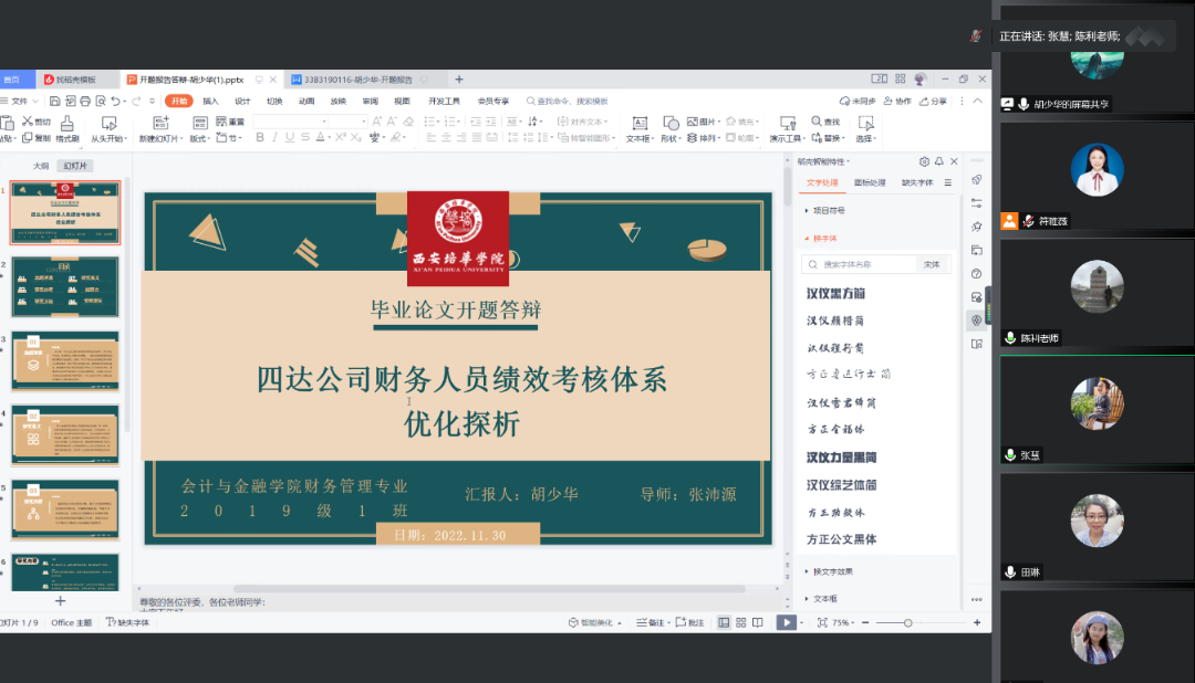 2022年11月30日,8:30会计与金融学院管理系开展财务管理专业毕业论文开题答辩工作。本次论文答辩由财务管理专业张亚娜负责主持,参加此次论文答辩的人员包括答辩组长、答辩组员、答辩秘书以及参加答辩的学生。答辩教师们在学生论文题目的基础上帮助学生梳理论文主要研究内容。并针对学生开题报告中的研究内容及拟解决的问题进行理论提问,提出整改与指导意见。毕业论文开题答辩是检阅大学生在校期间学习成果的重要形式之一。本次开题答辩工作的顺利开展,为大学生创造了一个完善自己专业知识的机会,通过查阅有关文献和向校外专家学习、请教指导,来发现自身存在的不足和缺点,从而完善自己的专业知识,更好的完成毕业论文。此外,还为同学们将来就业和深造奠定了重要的基础。
