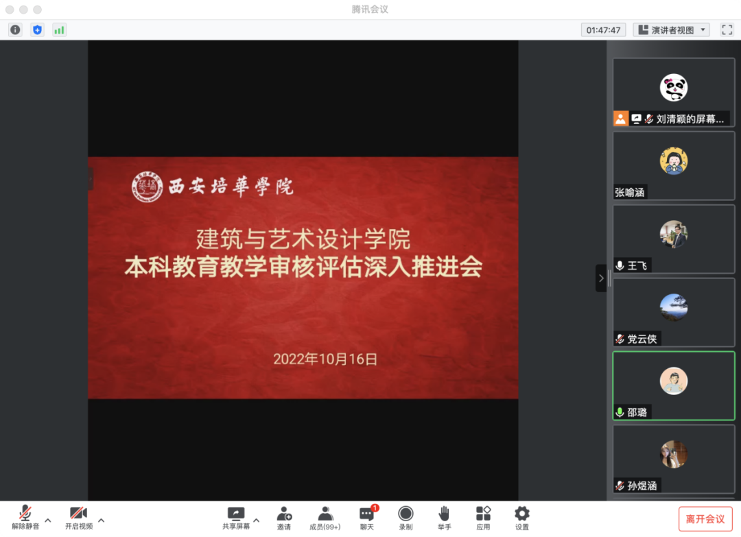 2022年10月16日,建筑与艺术设计学院线上召开了本科教育教学审核评估深入推进会。会议由建筑与艺术设计学院院长助理刘清颖主持,特邀西安培华学院发展规划与质量建设中心主任助理全婧,西安培华学院教务管理中心副主任刘斌做专项政策解读,建筑与艺术设计学院常务副院长徐莹、党委书记兼行政副院长王飞、产学研副院长邵露、教学副院长王虎就审核评估不同指标进行了详实的任务介绍及安排部署。审核评估是为了改进不足,促进学校的进一步发展,要坚持“校誉至上、质量第一、自强不息、开拓强进”的校训,建立“学生中心、产出导向、持续改进”的理念,形成“自觉、自省、自律、自查、自纠”的质量文化,促进学校质量保障体系和质量文化建设水平的整体提升。