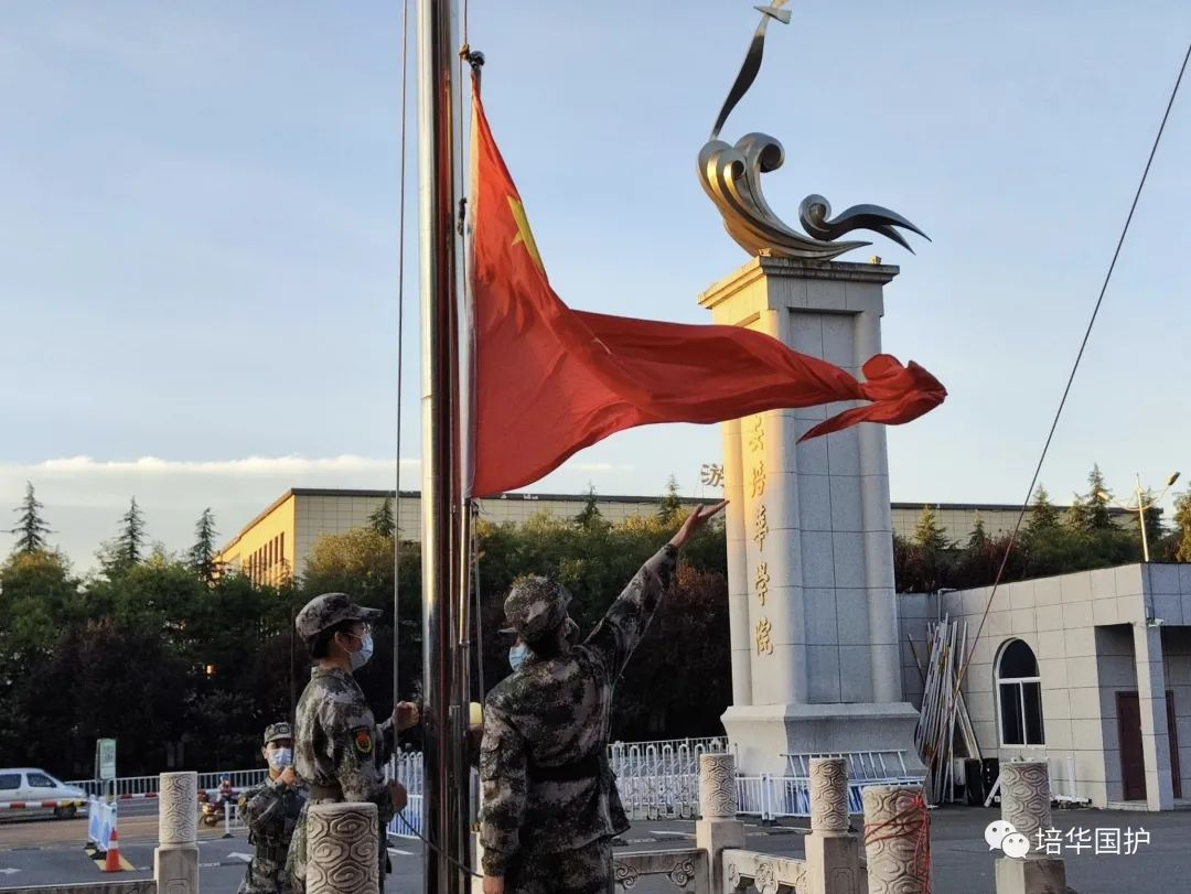 2022年10月10日,国旗护卫队的成员相聚在南门,举行升旗仪式。十月的清晨充盈着美好却夹杂着阵阵凉意,刺骨的寒风不断吹向少年们的脸庞,但旗组依然以饱满昂扬的姿态迎接庄严的升旗仪式。“正步走、齐步走、向国旗敬礼”春去秋来,嘹亮的口令早已打破了南门原有的宁静,对于国旗护卫队队员们来说却经久不厌。旗组坚定自信的眼神,仿佛在他们的眼中能看到那一抹中国红挂于旗杆之上高高飘扬的样子,因为于队员们而言,“忠诚、团结、责任、奉献”的八字队训时刻在提醒着他们要升起同一面属于我们的国旗。疫情隔不断感情,真心能唤醒信心。愿每一个生命如春,怒放着健康的美丽;愿祖国永远拥抱着春天的生机;愿五星红旗永远飘扬于整个神州大地。