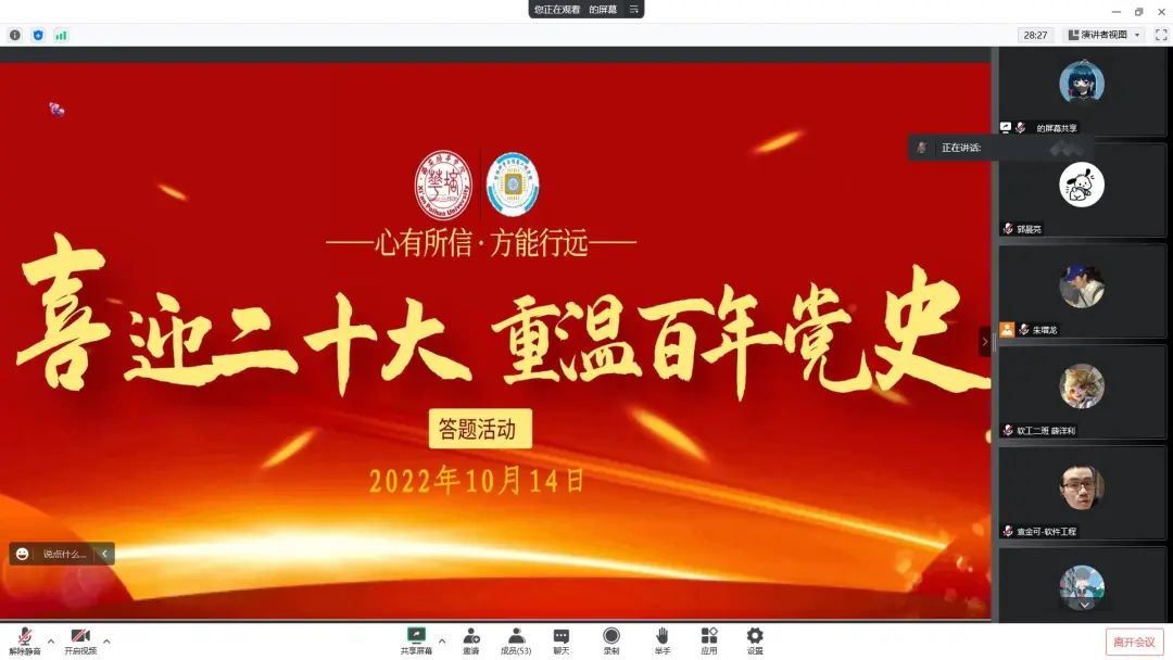 2022年10月14日,智能科学与信息工程学院举办“喜迎二十大,重温百年党史”答题竞赛活动。推动党史学习教育,营造红色氛围,从而让青年学子们铭记党的百年光辉历史。团委副书记袁安琪表示,此次活动是喜迎二十大的重要活动之一。回顾波澜壮阔的历史,青年奋进代表着国家变革。恰逢青年时,我们更应当像先辈们一样,用胸腔中的热血,浇筑崭新中华!即使身为工科的学生,我们仍需对党的历史多一些了解,以增强自身的使命感和社会责任感,少年智则国智,青年作为国家的后备军,应勤奋好学,为国家的发展尽一份力。通过本次活动,充分激发了广大青年的爱国使命感与责任感,使青年们更加坚定凝心聚力跟党走,砥砺奋进续华章的决心,为喜迎党的二十大胜利召开营造良好氛围。