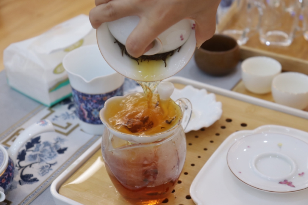 (高英茶业店员陈丽向成员讲解泡茶过程付兴琦摄)