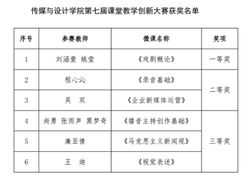 为贯彻全国教育大会精神,坚持立德树人根本任务,深入推进新文科建设,5月8日下午,传媒与设计学院在汇知楼第四会议室(小)举行了第七届课堂教学创新大赛,促进各专业教师及团队进行交流和学习,进一步推动课程及专业建设创新发展。