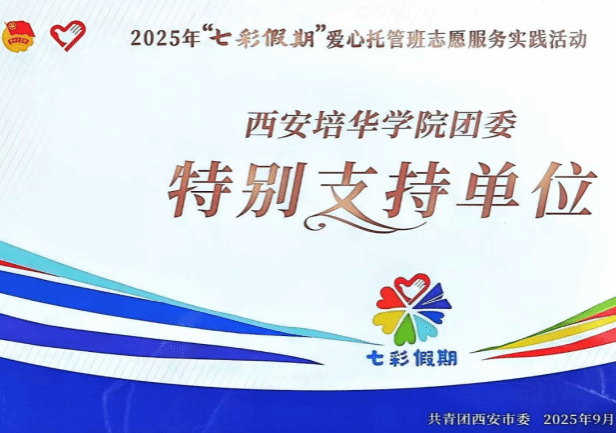 3.共青团西安市委授予西安培华学院团委2025 年七彩假期爱心托管班志愿服务实践活动“特别支持单位”称号。从校园到基层,从理论到实践,此次“七彩假期”专项活动,既以专业素养书写培华青年社会担当,亦用鲜活行动实现实践育人双向赋能。