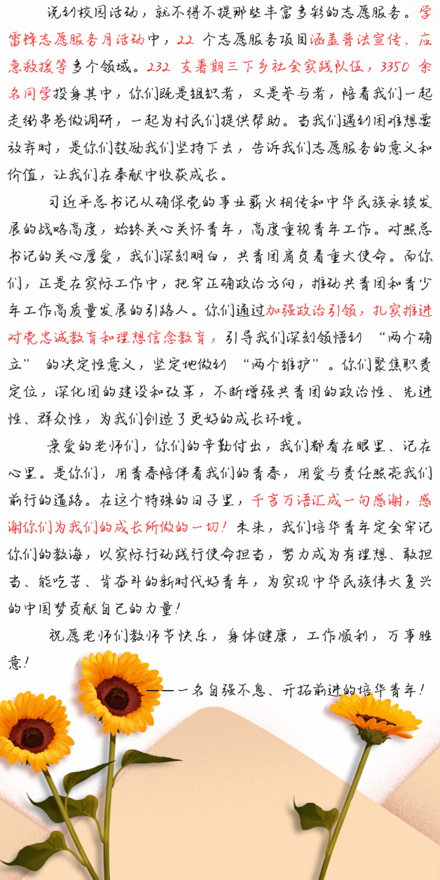 (3)围绕开学第一课、教师节、9.18纪念、亚足联U23亚洲杯预选赛志愿服务等关键节点,通过“培华青年”微信公众号、校团委官网等平台发布专题推文百余篇,向陕西日报、团省委新媒体平台报送通讯稿件3篇,其中《培华青年志愿者护航U23亚洲杯预选赛》获省级平台转载,扩大学校团工作影响力。