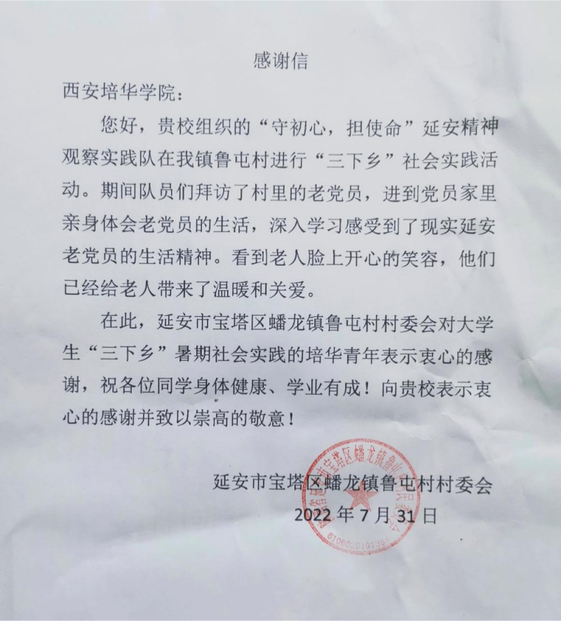 经过切身实地的体会革命征途中的艰难险阻,实践队队员们感悟到伟大的延安精神,引领培华青年从党史中汲取营养,为实现中华民族伟大复兴贡献青春力量。