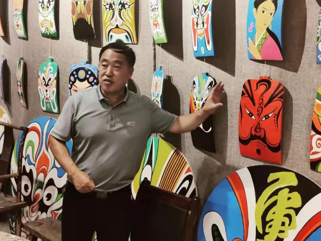 图为非遗馆负责人在给智小信调研团讲解红色脸谱的含义