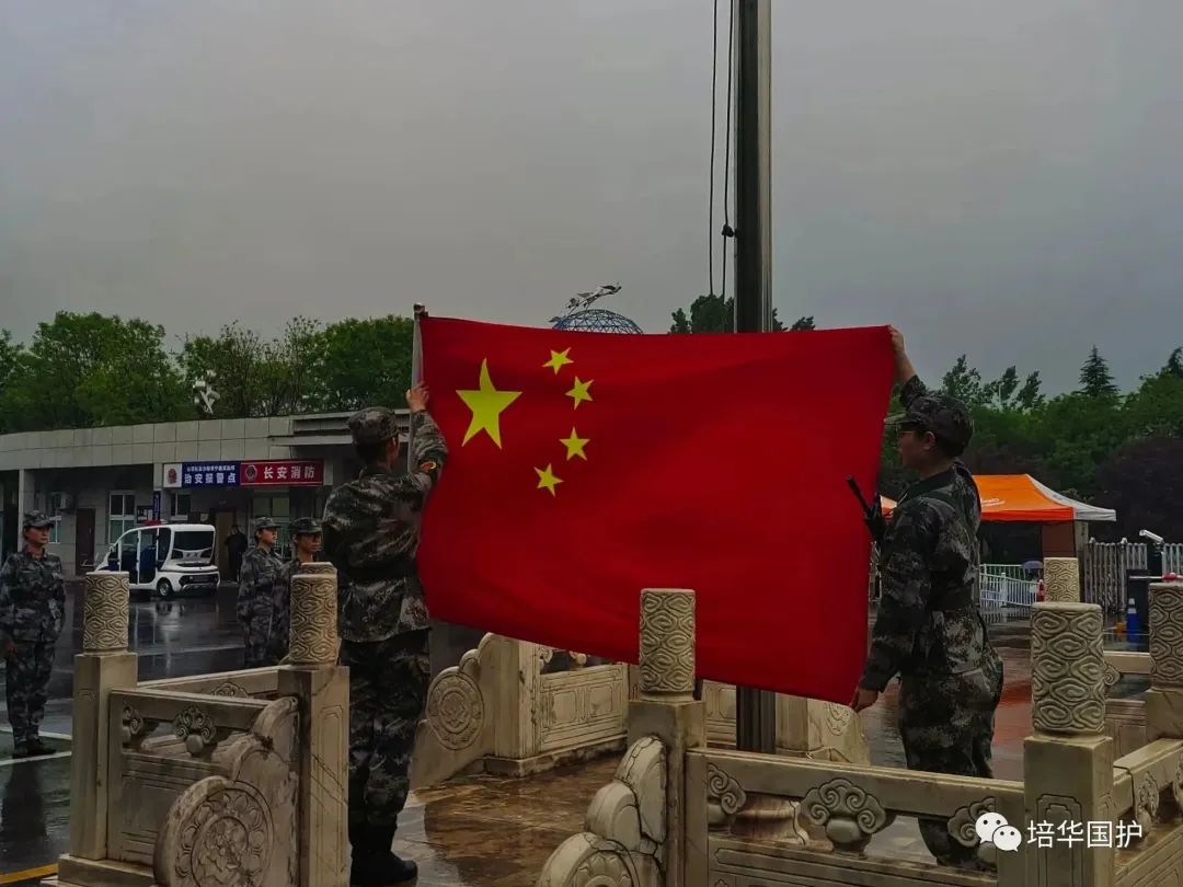 肩负着五星红旗,自信地昂首阔步,旗手熟练的动作,饱含平日的努力,国旗缓缓下降,降旗仪式结束。
