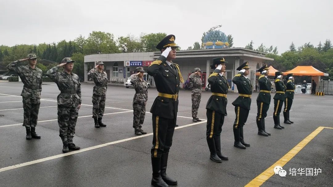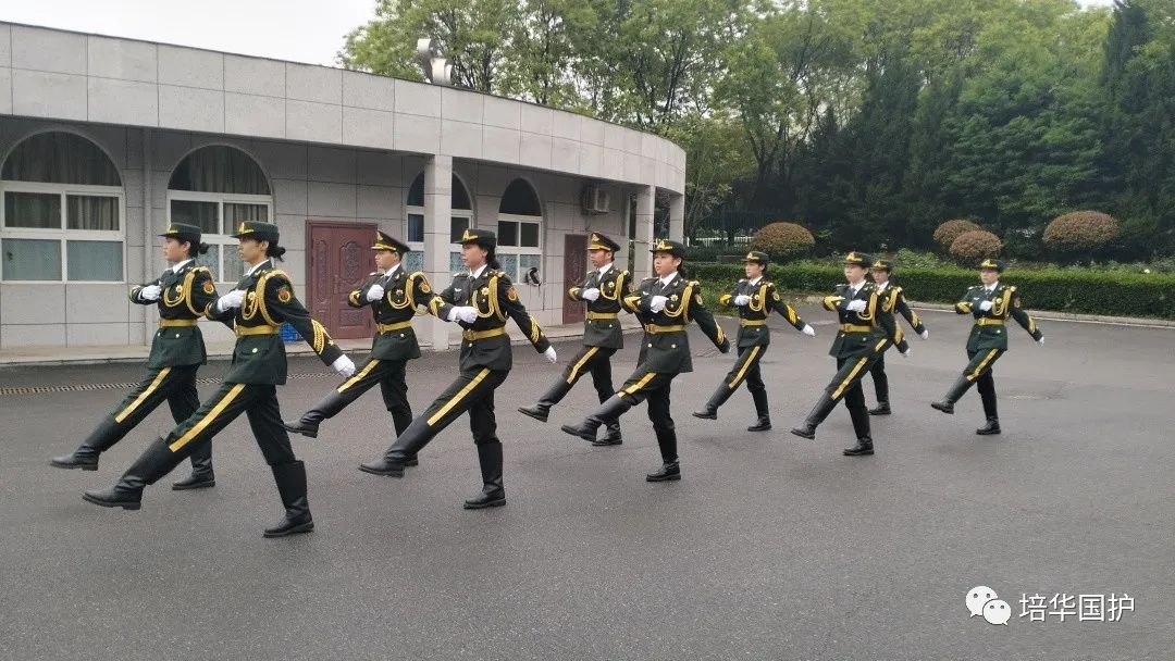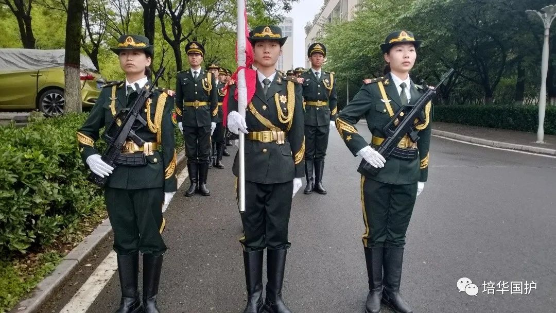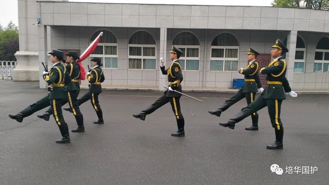 清早,一支整齐的队伍在培华校园的路上集结出发,踏着整齐划一的步伐,迎晨曦南行。队员们军装笔挺,帽徽、肩章、领带、绶带、腰带整理的一丝不苟,洁白的手套和漆黑的皮靴划出完美的弧线,刀手所执的佩刀在朝阳下熠熠生辉。候场场地,国旗的红、晨光的金、军装的绿,组成了国旗护卫队第八周周一清晨的色彩。
