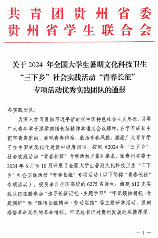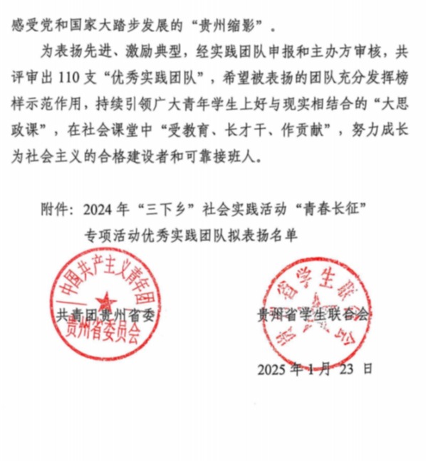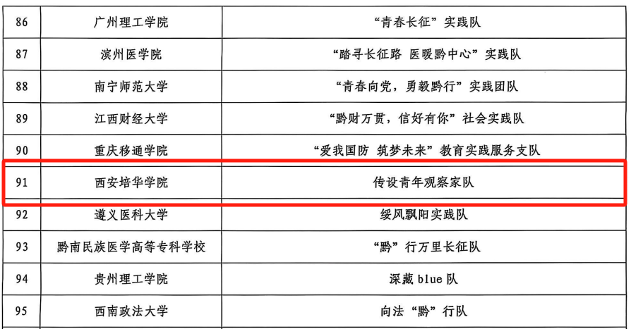 近日,由团贵州省委在2024年全国大学生暑期文化科技卫生“三下乡”社会实践活动期间开展“青春长征”专项研学活动评选结果揭晓。西安培华学院传媒与设计学院“传设青年观察家”专业实践团队从全国六百余支队伍中脱颖而出,跻身全国高校TOP110榜单,并斩获“优秀实践团队”称号,团队指导教师王雅璇,团队负责人陈志雪等12名核心成员获专项表彰。