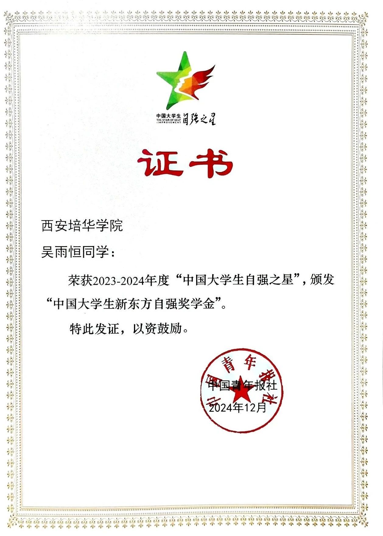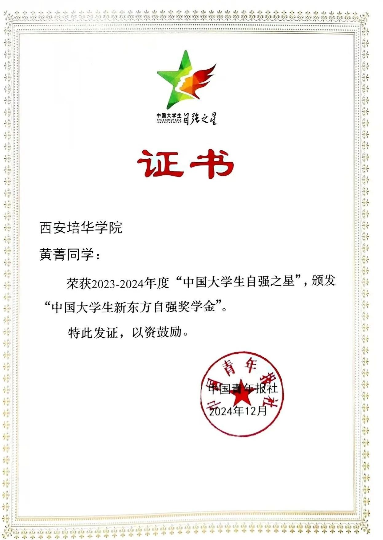 近日,由共青团中央、全国学联指导,团中央基层建设部、中国青年报社主办的2023-2024年度“中国大学生自强之星”奖学金评选结果正式揭晓。我校会计与金融学院黄菁、智能科学与工程学院吴雨恒两位同学荣获“中国大学生自强之星”荣誉称号。