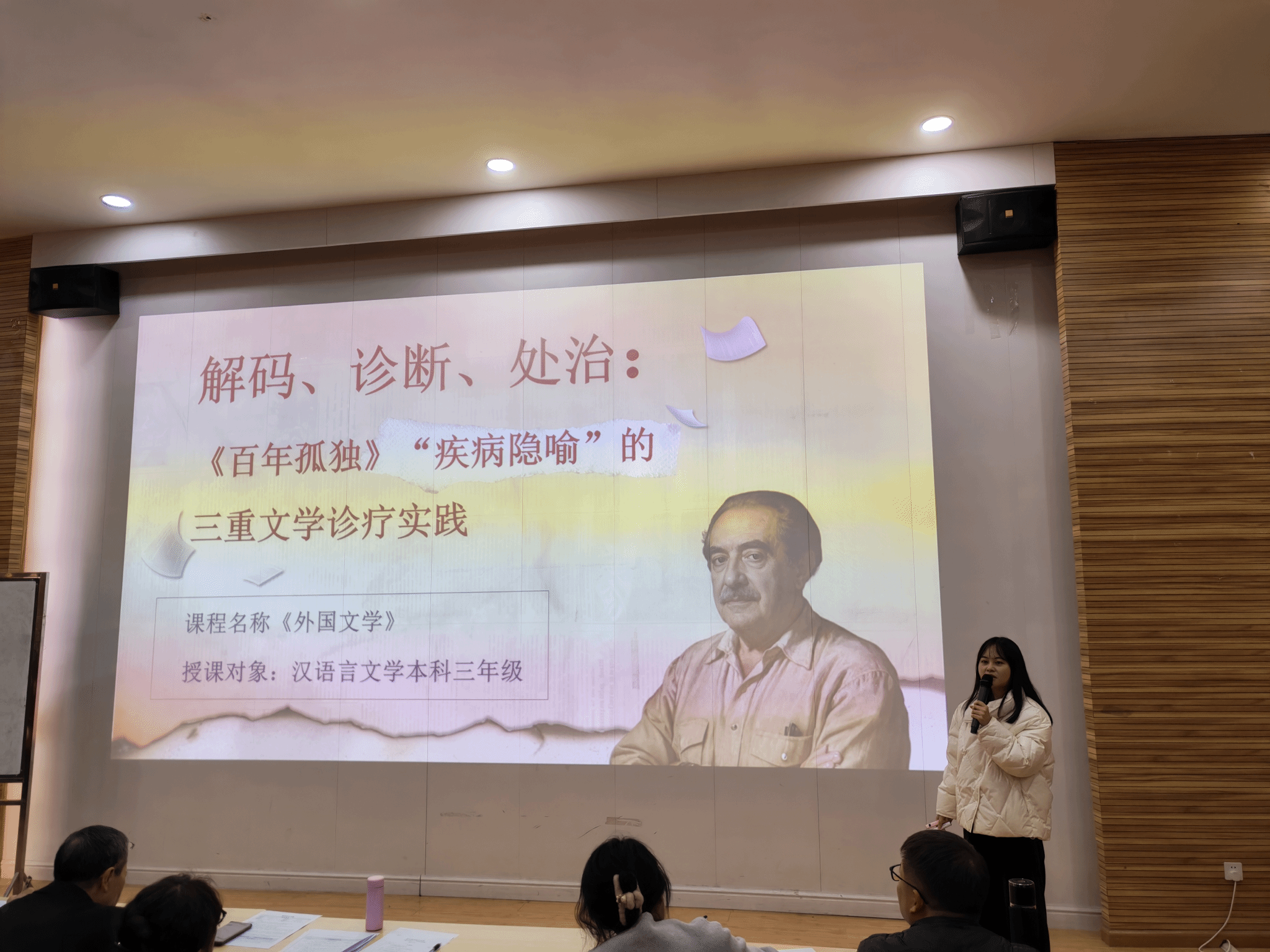 竞赛环节中,4位青年教师围绕不同主题精心设计课堂,展现了扎实的专业功底与鲜明的教学风格。兰兰草老师以古文教学为切入点,注重语言知识的传授与学生翻译能力的培养;梁艺凡老师聚焦苏轼诗词,尝试将诗人生平与作品内涵相融合,挖掘课程思政元素;覃茜茜老师教学经典外国文学,尝试将文学与时代背景相结合,引导学生从个体命运的故事中窥见更广阔的社会图景;贾红分老师则以戏剧命运观为核心,对比分析中西方不同作品的悲剧内涵,探索学科交叉教学路径。