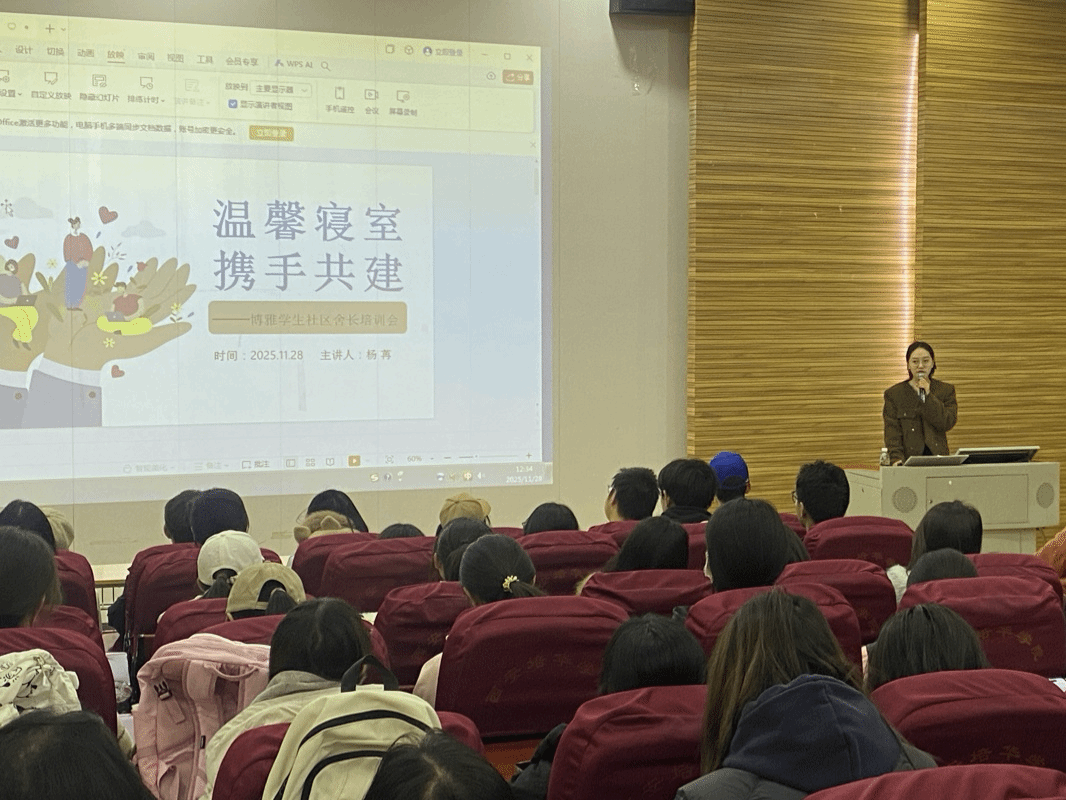 为进一步规范学生宿舍管理,强化舍长责任意识,提升宿舍治理水平,营造安全、文明、和谐的校园住宿环境,2025年11月28日中午12:30,博雅学生社区以“温馨寝室,携手共建”为主题,于格物楼J101教室组织召开。本次培训由杨苒老师主讲,2025级生活委员、舍长参会。