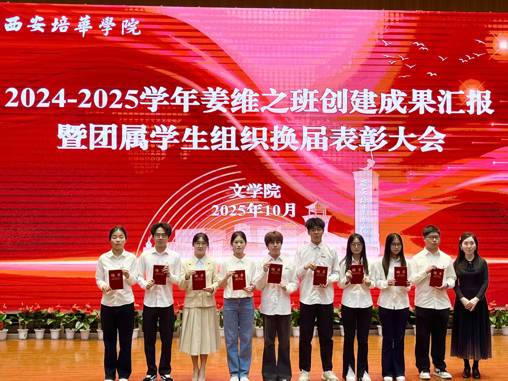 为进一步落实立德树人根本任务,营造爱党爱国爱校、学风浓厚的良好学习氛围,持续推进“姜维之班”创建工作走深走实,进一步增强团学组织的凝聚力、向心力,促进学生成长成才和学院高质量发展。2025年10月20日18时,文学院在维之图书馆报告厅召开2024-2025学年“姜维之班”创建成果汇报暨团属学生组织换届表彰大会。文学院领导班子成员、校团委书记董莹、校团委志愿服务部部长罗娜、教师代表、全体辅导员老师及学生干部参加了本次大会,共同见证、展望未来。本次大会由文学院辅导员吴庚键和何欢主持。