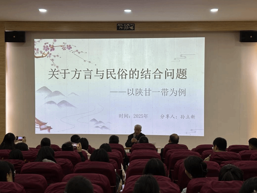 讲座伊始,孙立新老师以“方言与民俗的交叉领域”为切入点,指出现代方言学的兴起与民俗研究紧密相连,并重点介绍了陕甘地区方言与民俗结合研究的丰硕成果。孙立新教授还结合自身研究经历,分享了《biang字的文化解读》《关中方言哭丧棒调查研究报告》等代表性成果,从方言学与民俗学双重视角,解析了陕甘地区独特的语言文化符号与民俗仪式内涵,让在场师生深刻感受到地域文化的厚重底蕴。讲座中,孙立新教授从方言语音、词汇等层面出发,重点探讨了古音与今音的传承与演变关系,以及方言词汇的发展规律,不仅让大家了解了古音与今音、方言词汇发展的学术知识,更唤起了每个人对本土语言文化的珍视。
