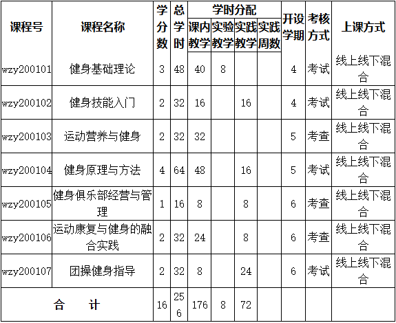“健身指导与管理”微专业课程体系以3门专业基础课和4门专业主干课程为框架。其中,专业基础课7学分、112学时,专业主干课9学分、144学时,共计 16学分、256学时。
