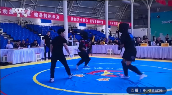 值得一提的是,在70 公斤级的比赛中,李海涛与张承新的对决堪称焦点之战。赛场上,两位选手身手矫健,攻防转换迅速,精彩的较量赢得了现场观众的阵阵喝彩。担任本场比赛裁判员的正是培华2022级学生雷杰。而这场精彩的比赛还被中央电视台CCTV-5 进行录像并转播,让全国观众得以欣赏到红拳的独特魅力以及培华学子在赛场上的专业风采。