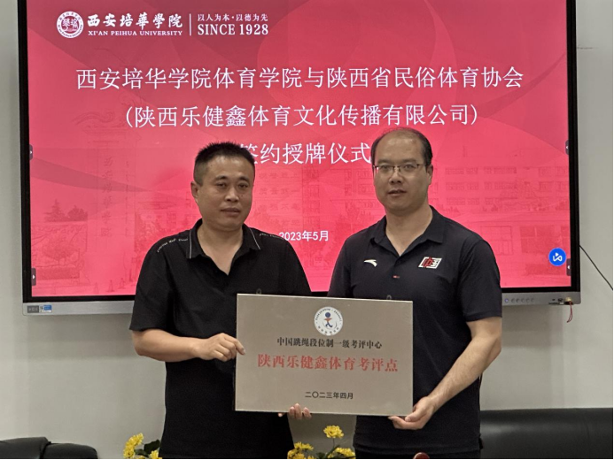 会议开始,首先西安培华学院监事会主席、党委副书记、纪委书记、工会主席、体育工作委员会主任徐国富致欢迎辞。随后,西安培华学院体育学院王志强院长与陕西省民俗体育协会(陕西乐健鑫体育文化传播有限公司)杨坤主席签订合作协议,并授予我院“陕西省民俗体育运动人才培养基地、陕西省跳绳裁判员培训基地、陕西省跳绳教练员培训基地,以及中国跳绳段位制一级专评中心(陕西乐健鑫体育考评点)”。与此同时,我院代表学校向陕西省民俗体育协会授予西安培华学院民俗体育教研学实践基地,之后进行了隆重的授牌仪式。