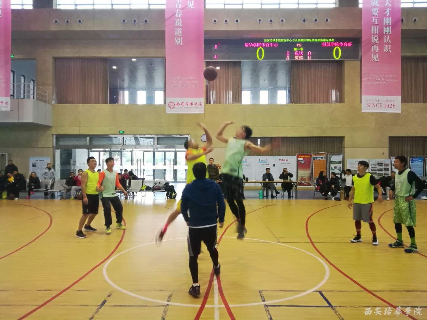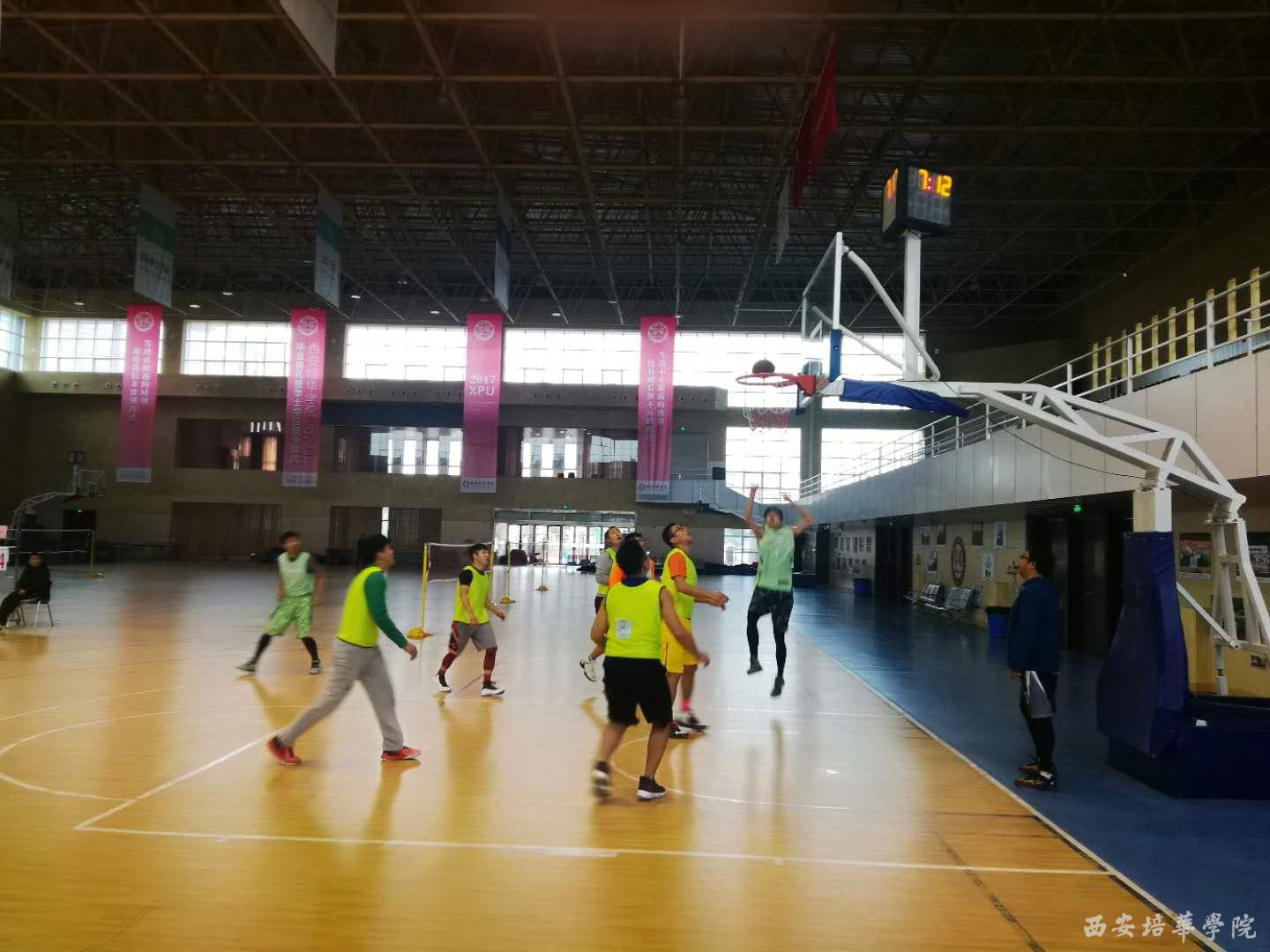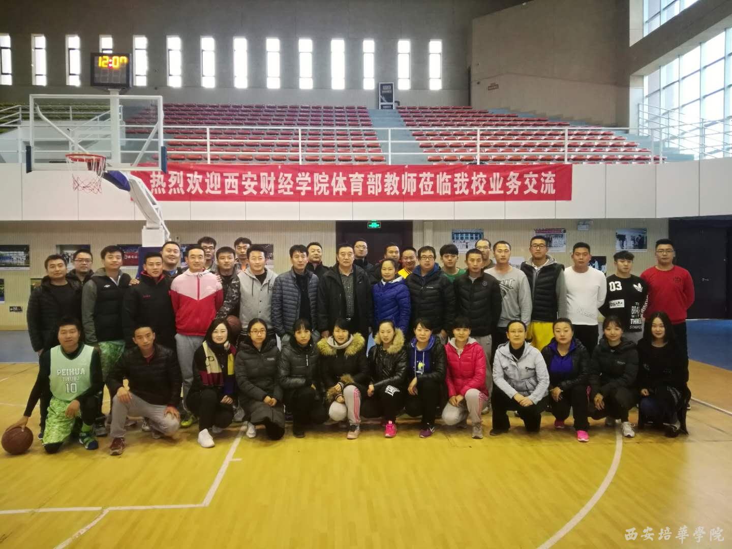 11月22日上午,在西安培华学院体育馆进行了一场篮球友谊赛,随着裁判员的哨音响起,正式拉开了我校体育中心与西安财经学院体育部教师业务学习、交流系列活动的序幕。此次系列交流活动的项目有:篮球、足球、羽毛球、乒乓球、游泳等。其目的是为了增进兄弟院校间的情感交流,提高教师的业务能力及专业技术素养,促使体育教师长期能保持较好的运动状态,不断提高自己的业务能力,进而提高课堂体育教学的质量。比赛在激烈、和谐的气氛中结束,在本次比赛中,双方的教师都发挥出了相应的技战术水平和良好的体育道德风貌,增进了友谊,提升了教师的业务能力。