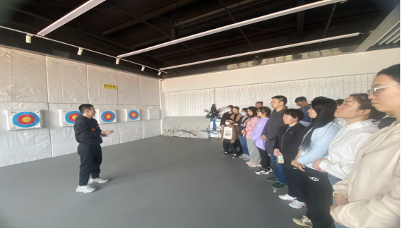 正式训练开始前,先进行了充分的热身运动,帮助老师们避免肌肉运动损伤,最大程度提高身体的灵活性。而后引导老师们使用弹力带进行拉弓动作的模拟训练,帮助老师们更好地体会拉弓这一动作,掌握正确的射箭姿势。在最后的射箭实操过程中,老师们展现出充分的热情,通过对老师们拿弓、拉弦、瞄准等动作的耐心指导,逐渐掌握了射箭的技巧和要领,随着训练的深入,老师们的射箭水平也愈发精湛,有的老师甚至射中了靶心,赢得了众人的喝彩!体验课程结束后,老师们进行了合影留念。