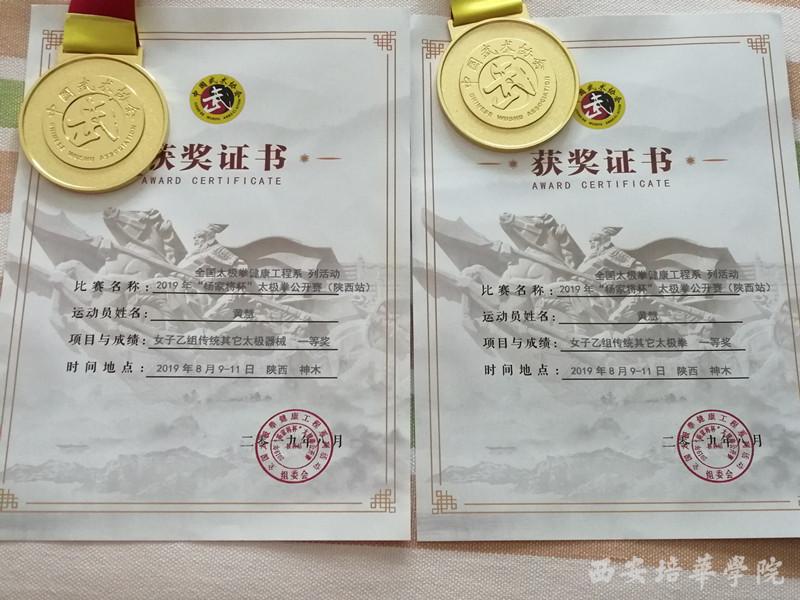 另悉,8月8日由国家体育总局武术运动管理中心、中国武术协会、陕西省体育局主办;陕西省武术运动管理中心、陕西省武术协会、榆林市体育局、神木市人民政府承办的全国太极拳健康工程系列活动——2019 年“杨家将杯”太极拳公开赛(陕西站)在神木市体育馆盛大开幕。我校太极拳俱乐部主任黄慧老师参加本次比赛,取得了女子太极拳及女子太极器械一等奖的优秀成绩。