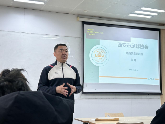 开班首日,西安市足球协会董坤讲师现场授课。在室内理论教学环节,借助多媒体设备,结合丰富的案例,向学员们详细讲解足球竞赛规则。例如,在剖析竞赛规则第11章“越位”时,不仅阐述了越位的定义,还通过视频片段展示实际比赛中的越位场景,让学员们能更好地理解和判断。