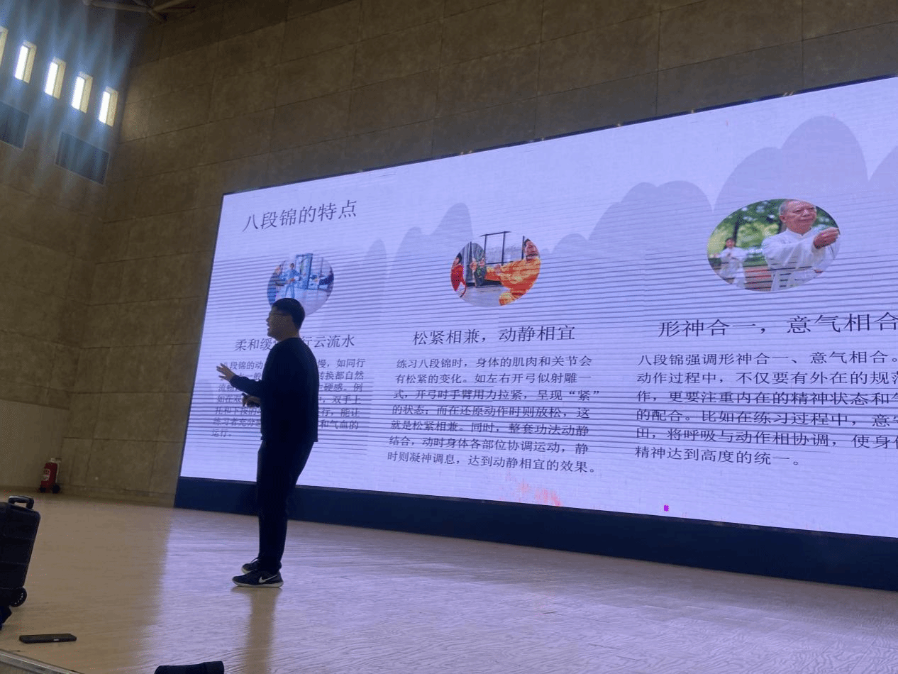 在八段锦基础教学环节,丁景阳老师先讲解八段锦的起源与文化背景,让教职工们感受传统养生文化的魅力;随后详细介绍标准八段锦八个动作的名称与特点,通过现场示范配合动作要领讲解,帮助大家精准掌握动作细节;针对教师久坐、久站的工作特点,丁老师还特别提示了相关动作的练习重点,让教学更具针对性。