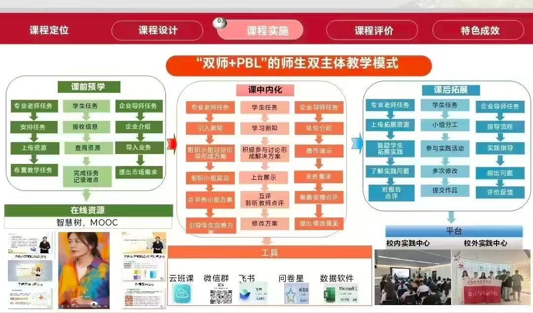 在校内选拔阶段,《数据营销》课程团队在教学设计逻辑、企业资源联动和学生实践成效等方面表现突出,获得学校推荐参加全国比赛的资格。团队围绕产教融合理念,构建了以“双师+PBL”为核心的教学模式,即由专业教师与企业导师协同授课,通过项目式学习(PBL)贯穿课前、课中、课后全过程,实现课堂教学与企业实践的深度结合。