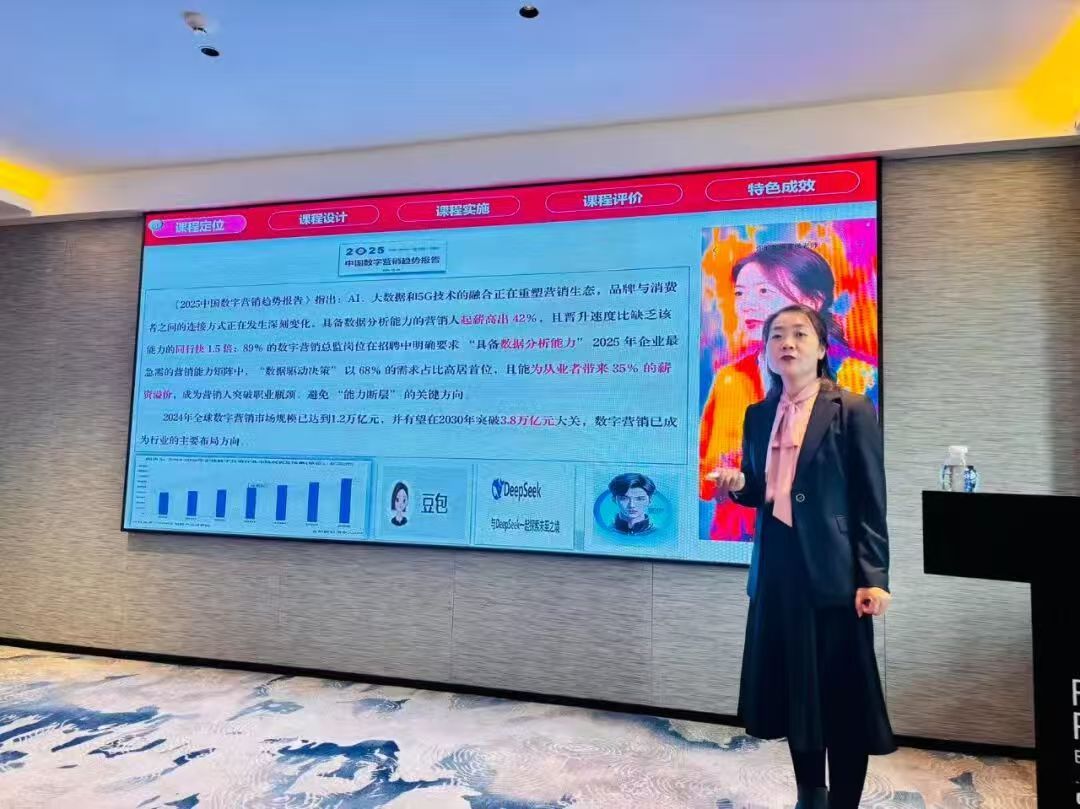 在比赛说课展示环节,丁阳副院长结合行业研究报告和数据分析图表,对课程建设背景与行业需求进行了系统阐释。他指出,在数字经济背景下,企业对数据分析与数据驱动决策能力的需求不断提升,《数据营销》课程正是围绕企业数字化营销实践进行课程设计,通过案例分析与实践项目培养学生的数据分析能力与营销决策能力。