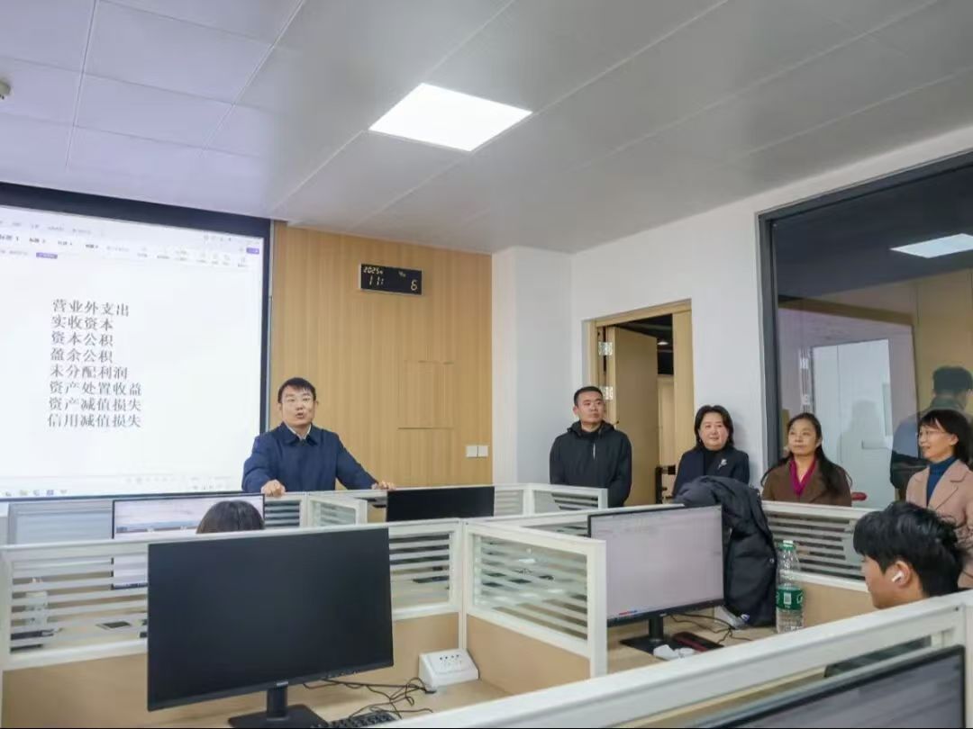 慰问活动在未来产业学院三楼的“审计共享人才联合培养基地”办公区举行。校长助理兼未来产业学院院长鲍伟,会计与金融学院党委书记兼行政副院长刘斌,会计与金融学院副院长孟君,教务管理中心副主任刘改琳,未来产业学院副院长丁阳以及企业代表周燕妮等一行来到实习办公区,看望正在基地开展实习实践的学生,并为同学们送上咖啡、水果等慰问品。