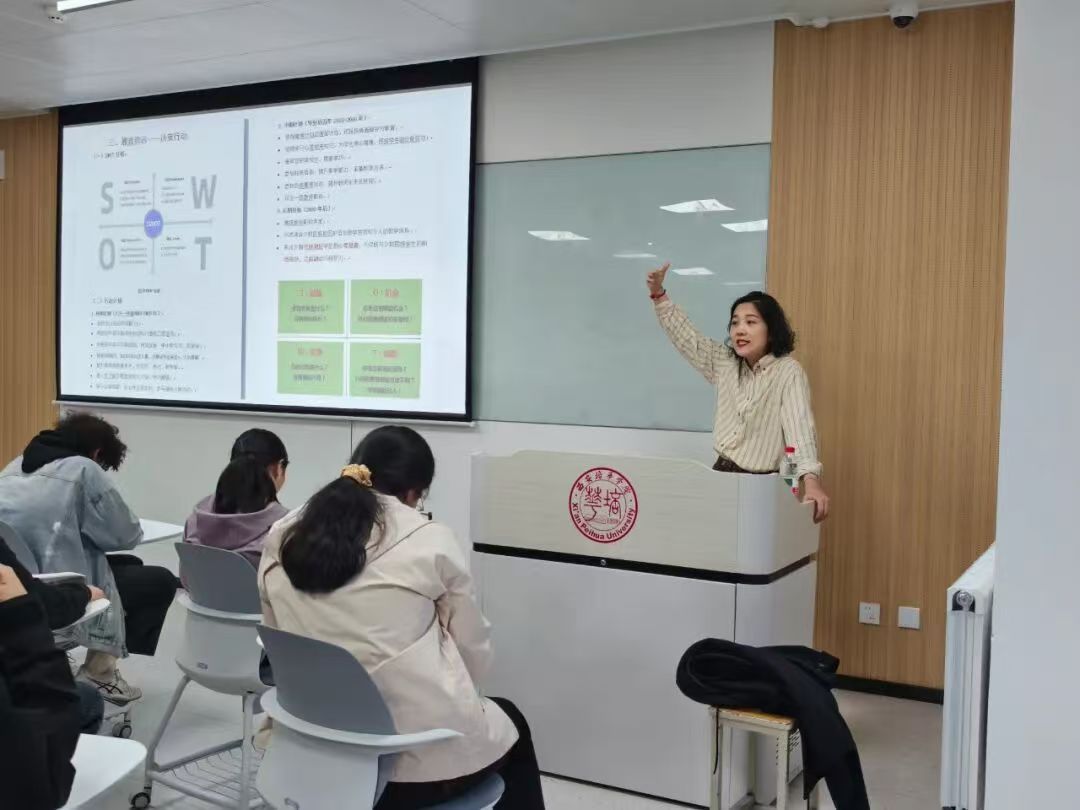 在展示环节方面,围绕PPT制作与现场表达进行了专项指导,强调首页需清晰呈现职业目标,后续内容应围绕规划路径展开,通过数据与实践案例增强说服力。同时,引入SWOT分析法,指导学生系统分析自身优势与不足,提升规划的逻辑性与可行性。